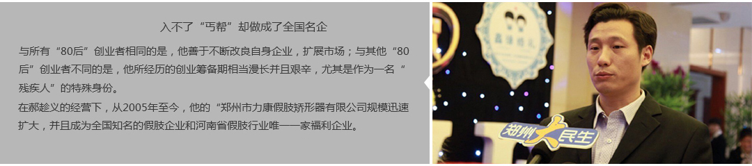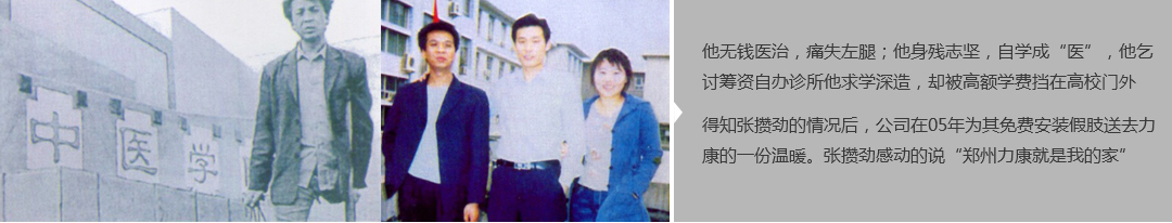 鄭州市力康假肢矯形器有限公司(簡稱力康),是一家專業(yè)從事假肢矯形器的設計、研發(fā)、制作及裝 配的專業(yè)機構(gòu)。成立于1992年是河南省唯一一家福利企業(yè)。力康下設業(yè)務部、技術(shù)部、住院部、康復 部、售后服務部,并配有現(xiàn)代化的裝配車間和功能齊全的訓練大廳,為殘疾朋友康復訓練提供了可靠 保障??偨?jīng)理穿戴假肢多年,有著豐富的臨床經(jīng)驗和親身體會;多年來,力康已為全國幾十萬名殘疾 朋友安裝上舒適、美觀、耐用的假肢和矯形器具,使他們更大限度地恢復了正常的工作和生活?!爱a(chǎn) 品即人品”的質(zhì)量理念、先進的技術(shù)、實惠的價格、完善的售后服務是力康取勝的法寶……